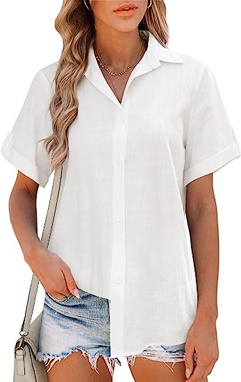 HOTOUCH Linen Button Down Shirt Women Roll-Up Cuffed Short Sleeve Blouses V Neck Collared Shirts Sum